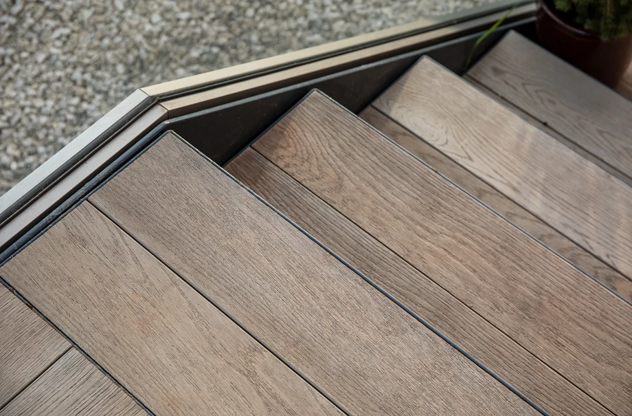 La terrasse en composite est un matériau hybride composé de fibres de bois et de résines polymères.